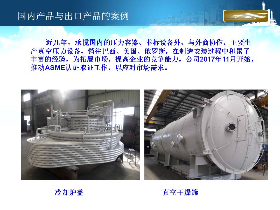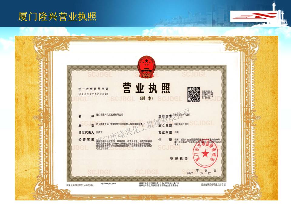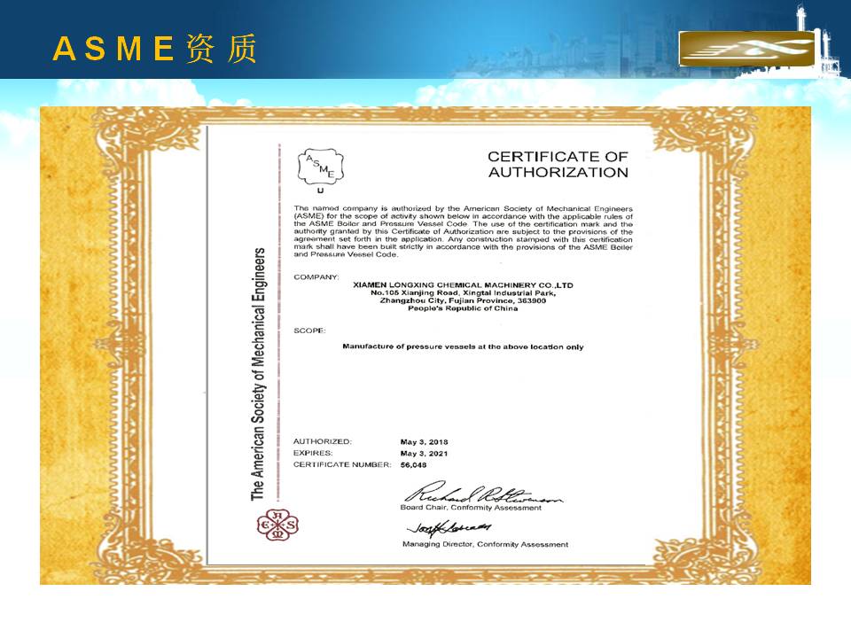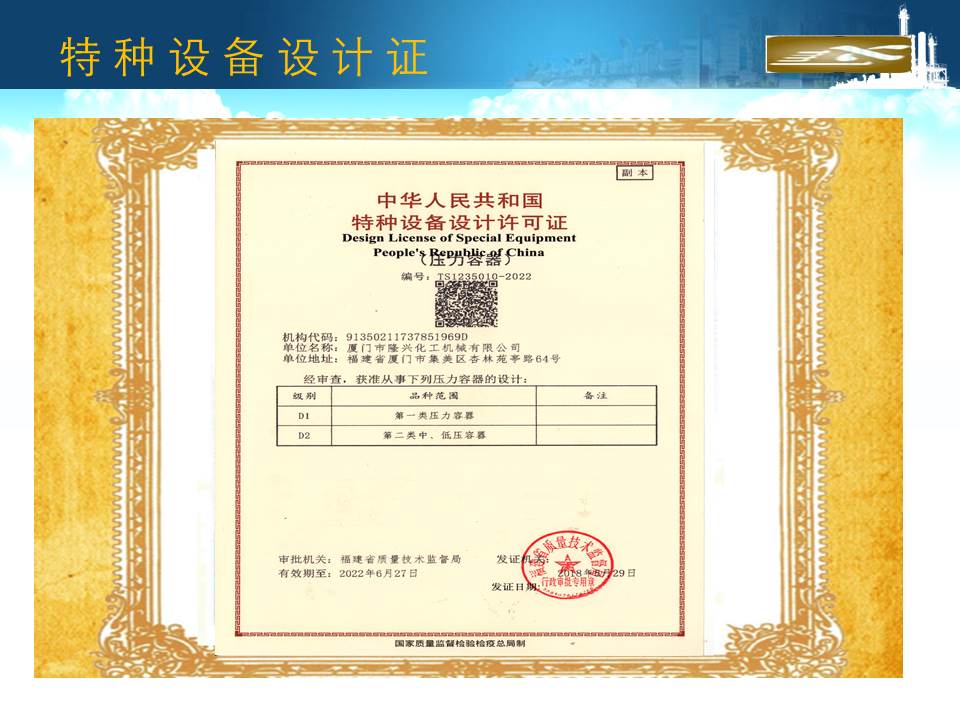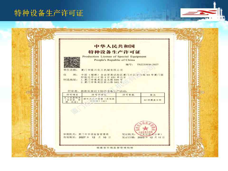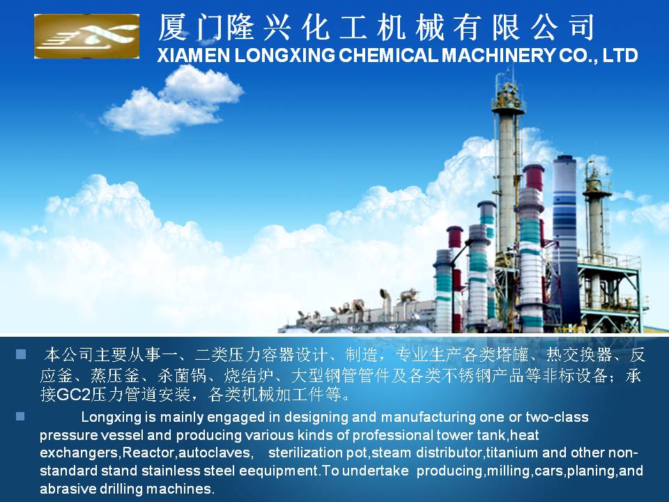 廈門隆興化工機(jī)械有限公司成立于2001年5月,占地面積30000平方米,擁有生產(chǎn)車間面積10000平方米及相關(guān)配套的辦公場(chǎng)所3000平方米,其中下料場(chǎng)所1000平方米,不銹鋼制作場(chǎng)所2000平方米,ASME產(chǎn)品制作區(qū)域1200平方米,無損曝光室30平方米。公司有職工135人,擁有專業(yè)的技術(shù)人員和管理人員36人。公司主要從事設(shè)計(jì)、制造A2級(jí)覆蓋D類壓力容器...